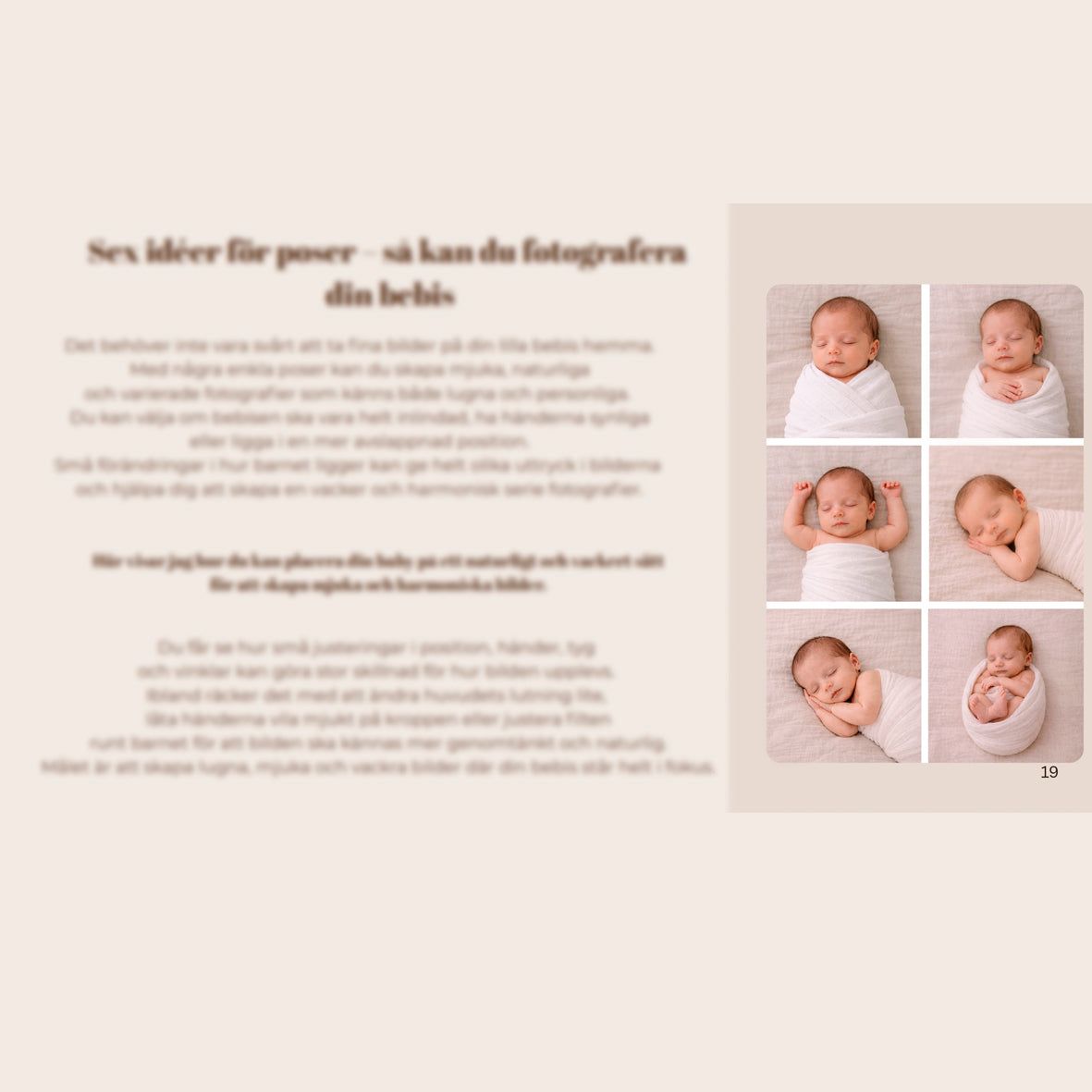 Du får också tips om små detaljer som kan göra stor skillnad i bilden, till exempel bakgrund, färger, filtar och hur du skapar en lugn och harmonisk känsla. Allt är förklarat på ett enkelt sätt, så att du kan fotografera din baby hemma även om du inte har tidigare erfarenhet av fotografering.