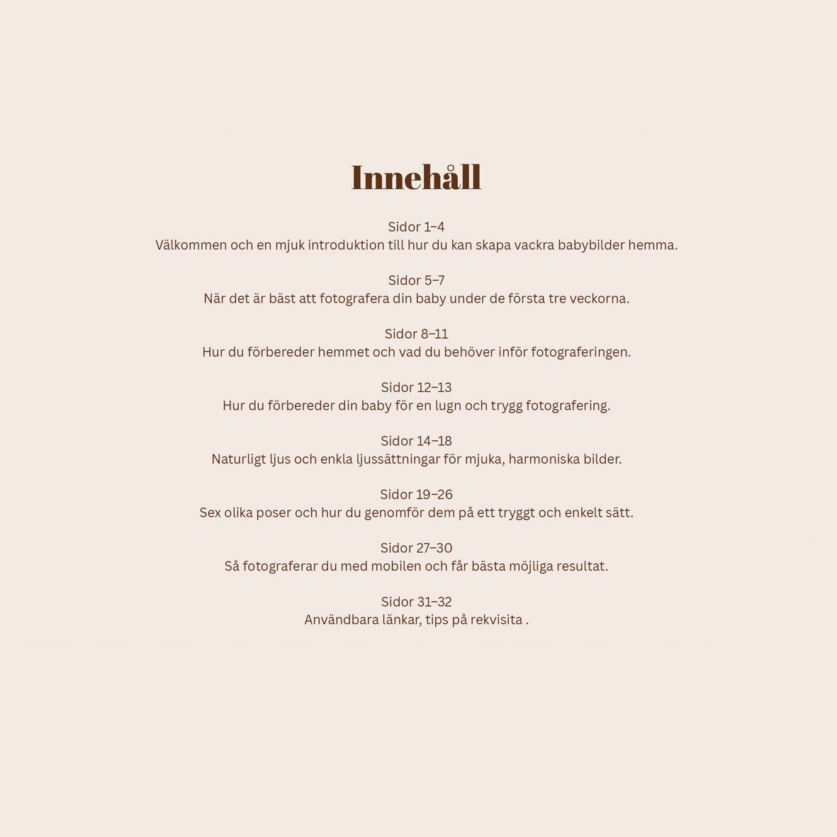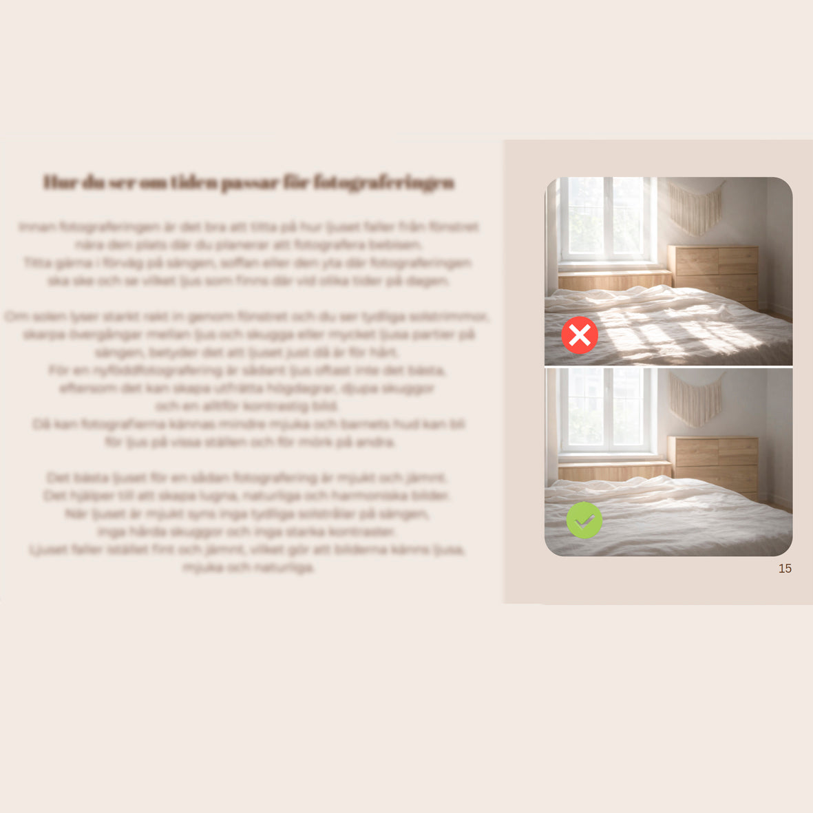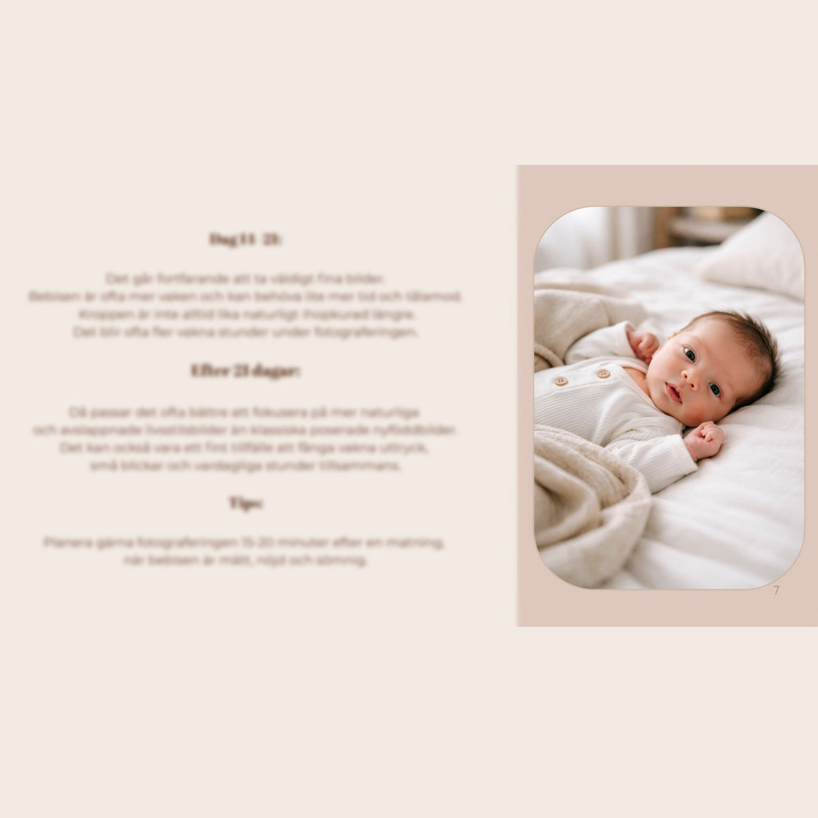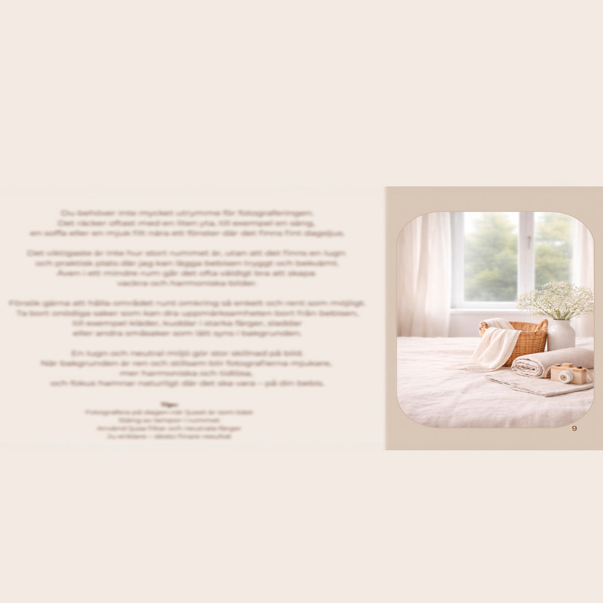 Guiden visar hur du kan använda det du redan har hemma – naturligt dagsljus från ett fönster, en mjuk filt, en lugn plats och enkla förberedelser. Du får tydliga råd om hur du väljer rätt plats i hemmet, hur ljuset ska falla, vilka vinklar som fungerar bäst och hur du kan förbereda barnet innan fotograferingen.